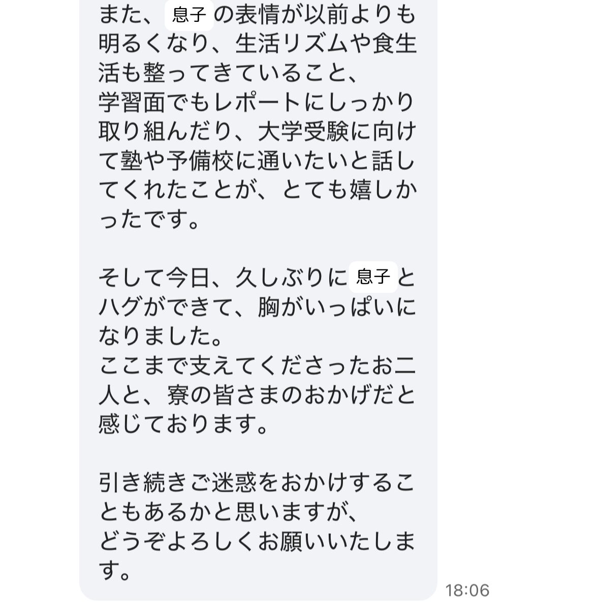 また、息子の表情が以前よりも明るくなり、生活リズムや食生活も整ってきていること、