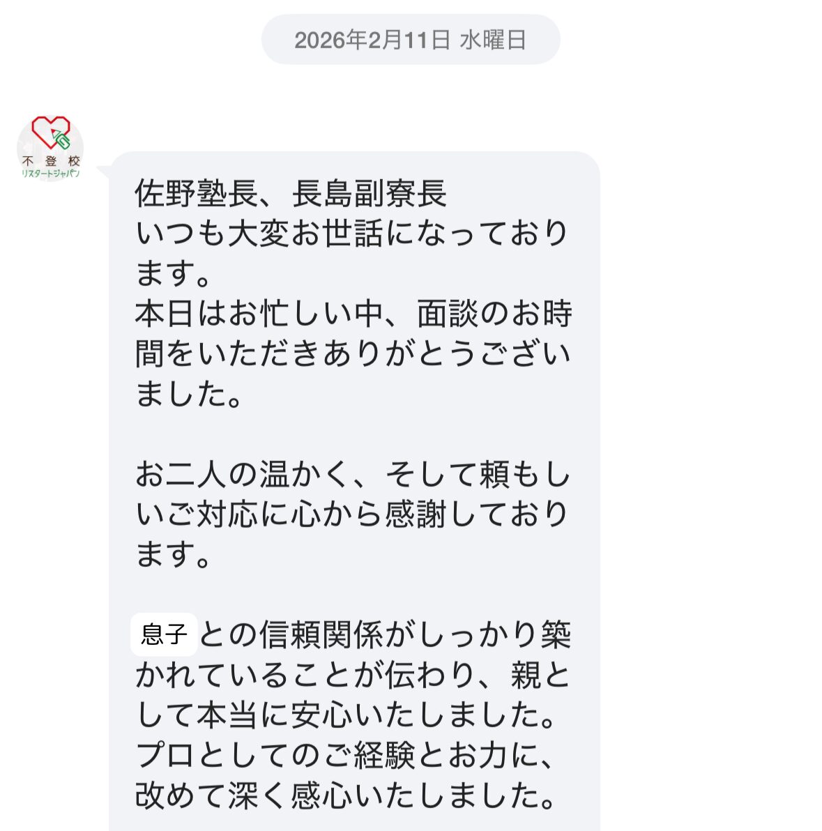 息子との信頼関係がしっかり築かれていることが伝わり、親として本当に安心いたしました。